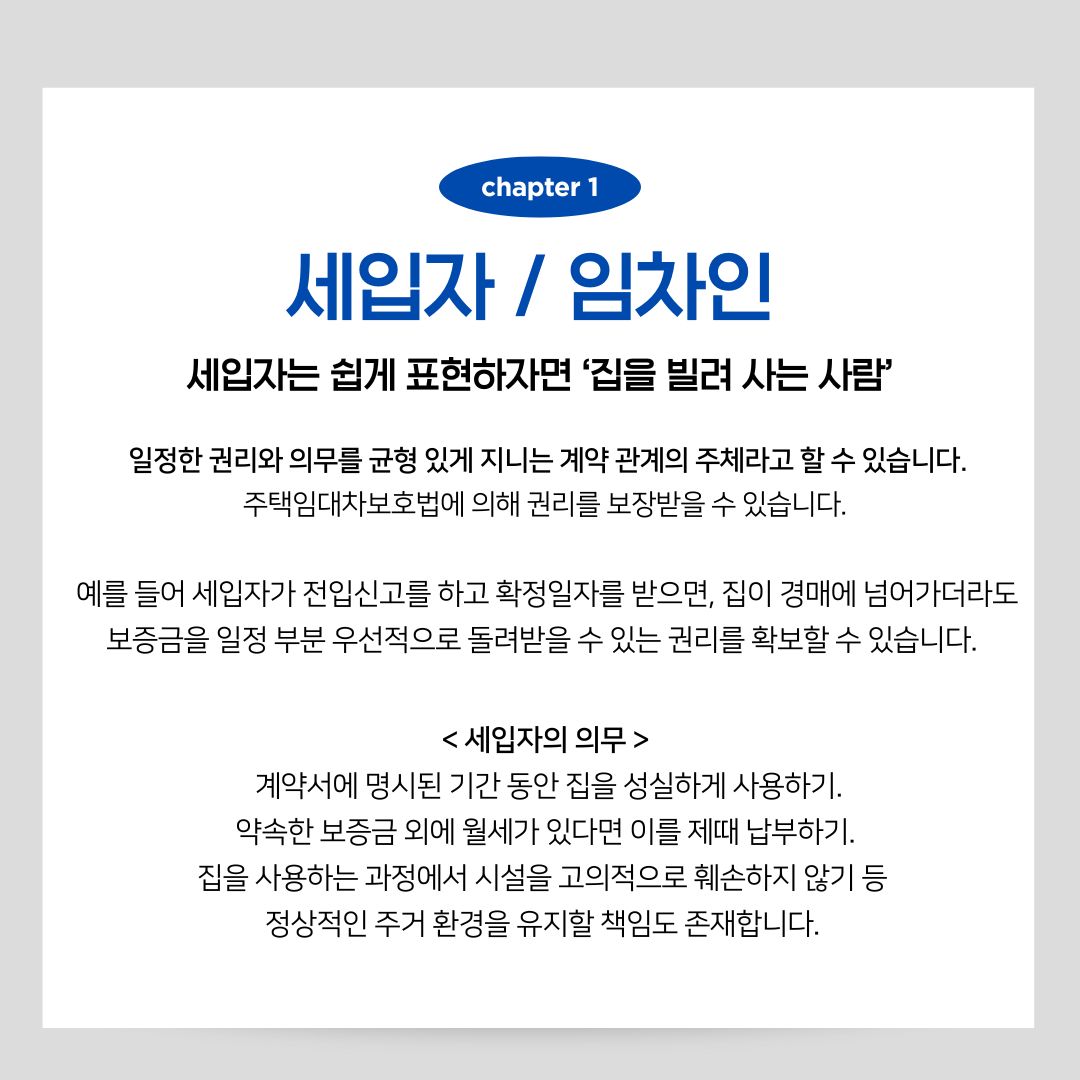 세입자(임차인)는 자신의 거주지를 마련하기 위해 일정한 권리와 의무를 동시에 가지게 됩니다. 세입자는 쉽게 표현하자면 ‘집을 빌려 사는 사람’이라고 쉽게 이해하시면 될 것 같습니다.