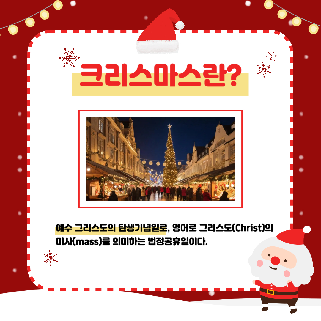 먼저 크리스마스란 예수 그리스도의 탄생기념일로, 영어로 그리스도(Christ)의 미사(mass)를 의미하는 법정공휴일입니다. 이날을 기념하여 크리스마스 트리를 장식하고, 크리스마스 조명으로 집과 거리를 꾸미며, 송년 파티와 같은 다양한 축하 행사가 열립니다.