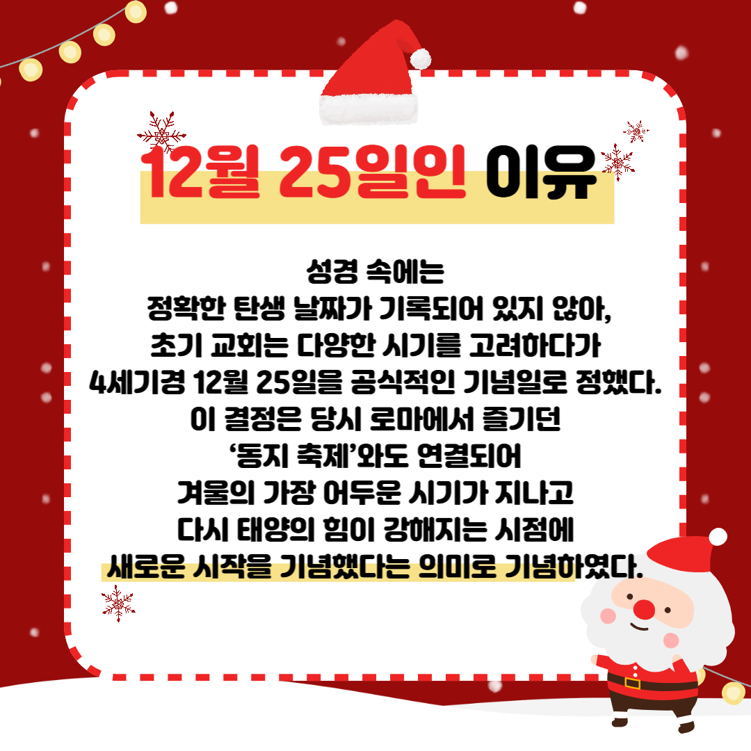 크리스마스는 예수 그리스도의 탄생을 기념하는 날로 알려져 있지만, 사실 성경 어디에도 예수가 12월 25일에 태어났다고 명시된 기록은 없습니다. 그럼에도 불구하고 오늘날 전 세계가 12월 25일을 크리스마스로 기념하게 된 데에는 역사적·종교적·문화적 배경이 복합적으로 작용했기 때문입니다. 신약성경의 마태복음과 누가복음에는 예수의 탄생 이야기가 등장하는데 목자들이 밤에 들판에서 양을 치고 있었다는 기록 때문에 일부 학자들은 탄생시기를 봄이나 가을로 추정하기에 12월 25일은 예수의 실제 생일이라기보다 상징적으로 선택된 날짜에 가깝습니다. 이후 4세기경 12월 25일을 공식적인 기념일로 정해졌는데, 이 결정은 당시 로마에서 즐기던 ‘동지 축제’와도 연결되어 겨울의 가장 어두운 시기가 지나고 다시 태양의 힘이 강해지는 시점에 새로운 시작을 기념했다는 의미로 기념하였다고 합니다.