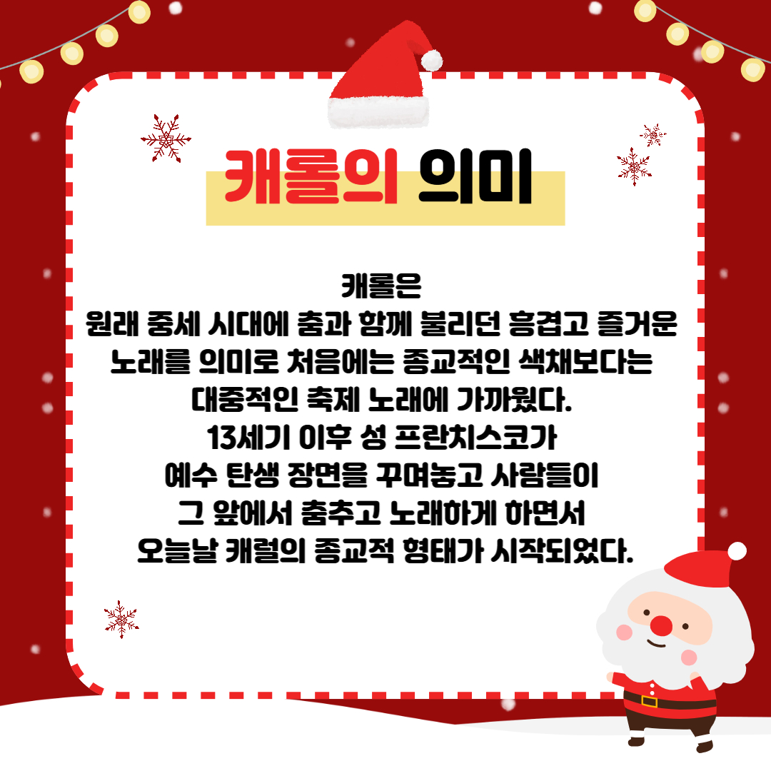 우리에게 크리스마스 캐롤은 단순한 노래가 아니라, 한 해를 마무리하며 서로의 안부를 묻고 온기를 나누는 문화적 언어로, 거리와 상점, 가정에서 울려 퍼지는 캐롤은 크리스마스가 지닌 기쁨과 평화의 메시지를 전달하는 큰 의미로 작용하게 되었습니다.