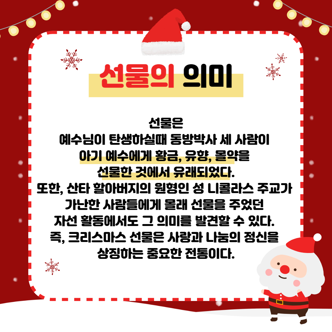 마지막으로 선물의 의미와 유래입니다. 지금의 크리스마스 선물은 사랑과 감사의 표현으로 자연스럽게 여겨지지만, 그 기원은 종교적 상징과 역사적 관습에서 비롯되었다. 크리스마스 선물 문화는 단순한 소비 행위가 아니라, 나눔과 헌신, 그리고 축복의 의미를 담고 있습니다.