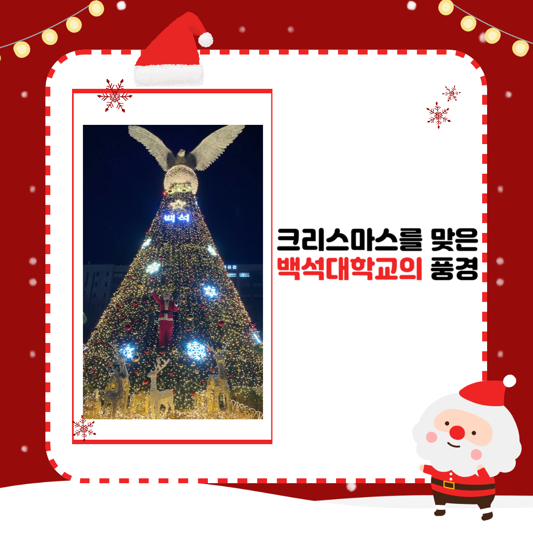 현재 백석대학교엔 크리스마스를 맞아 12월달부터 학교 곧곧에 크리스마스 트리와 전등을 설치해 반짝이게 해두었습니다. 밤에 학교의 전경을 바라보면 매우 아릅다운 모습을 볼 수 있습니다. 백석대학교는 글로벌 기독교 학교로 다양한 기독교적 문화를 챙겨오고 있습니다. 부활절 또는 추수감사절등 다양한 선물과 관습을 이어오고 있기에 기독교적 관점에선 큰 장점이라고 볼 수 있겠습니다.