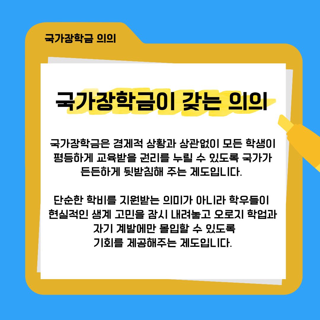 국가장학금은 경제적 상황과 상관없이 모든 학생이 평등하게 교육받을 권리를 누릴 수 있도록 국가가 뒷받침해 주는 든든한 제도입니다. 단순히 학비를 지원받는 의미를 넘어, 우리 학우들이 생계에 대한 고민을 내려놓고 오로지 학업과 자기 계발에만 몰입할 수 있도록 귀중한 시간을 선물해 주는 기회이기도 합니다. 학업에 대한 열정이 환경적인 요인으로 인해 위축되지 않도록 돕는 것이 이 제도의 핵심이라고 볼 수 있을 것 같습니다.