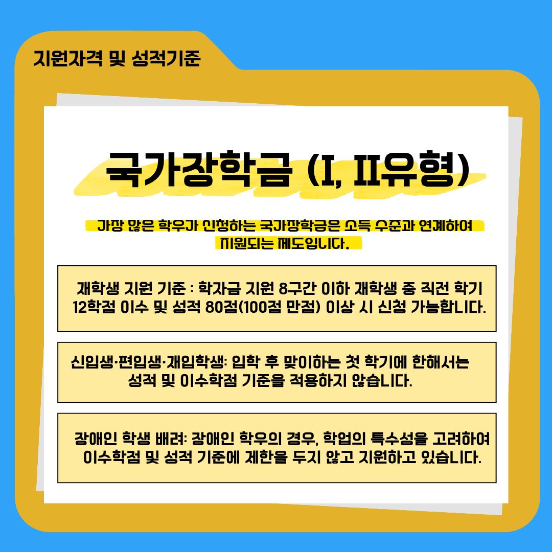 신입생·편입생·재입학생: 입학 후 맞이하는 첫 학기에 한해서는 성적 및 이수학점 기준을 적용하지 않습니다. 새로운 시작을 응원하는 취지인 만큼, 신입생분들은 부담 없이 신청하시기 바랍니다.