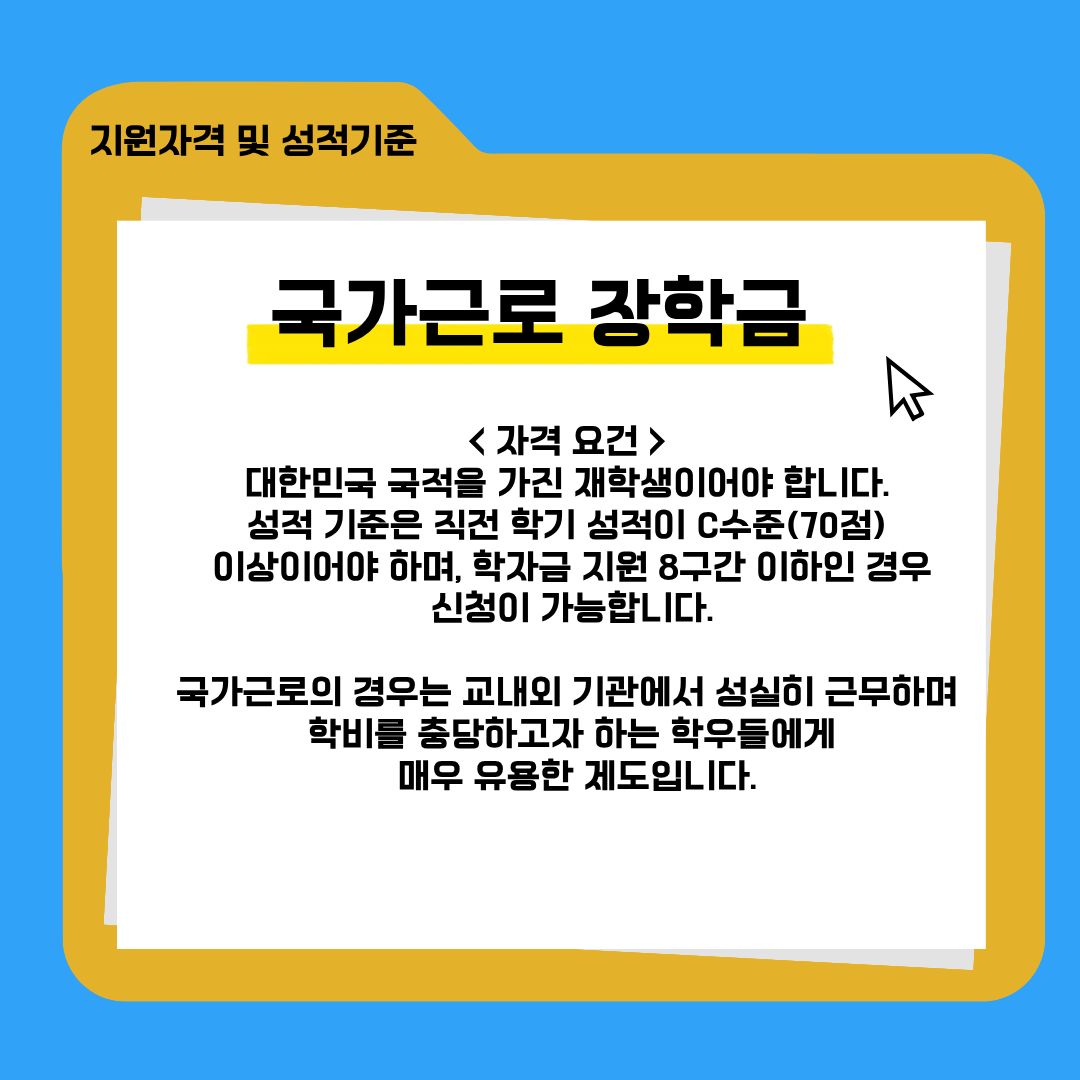 자격 요건: 대한민국 국적을 가진 재학생이어야 합니다. 성적 기준은 직전 학기 성적이 C수준(70) 이상이어야 하며, 학자금 지원 8구간 이하인 경우 신청이 가능합니다. 교내외 기관에서 성실히 근무하며 학비를 충당하고자 하는 학우들에게 매우 유용한 제도입니다.
