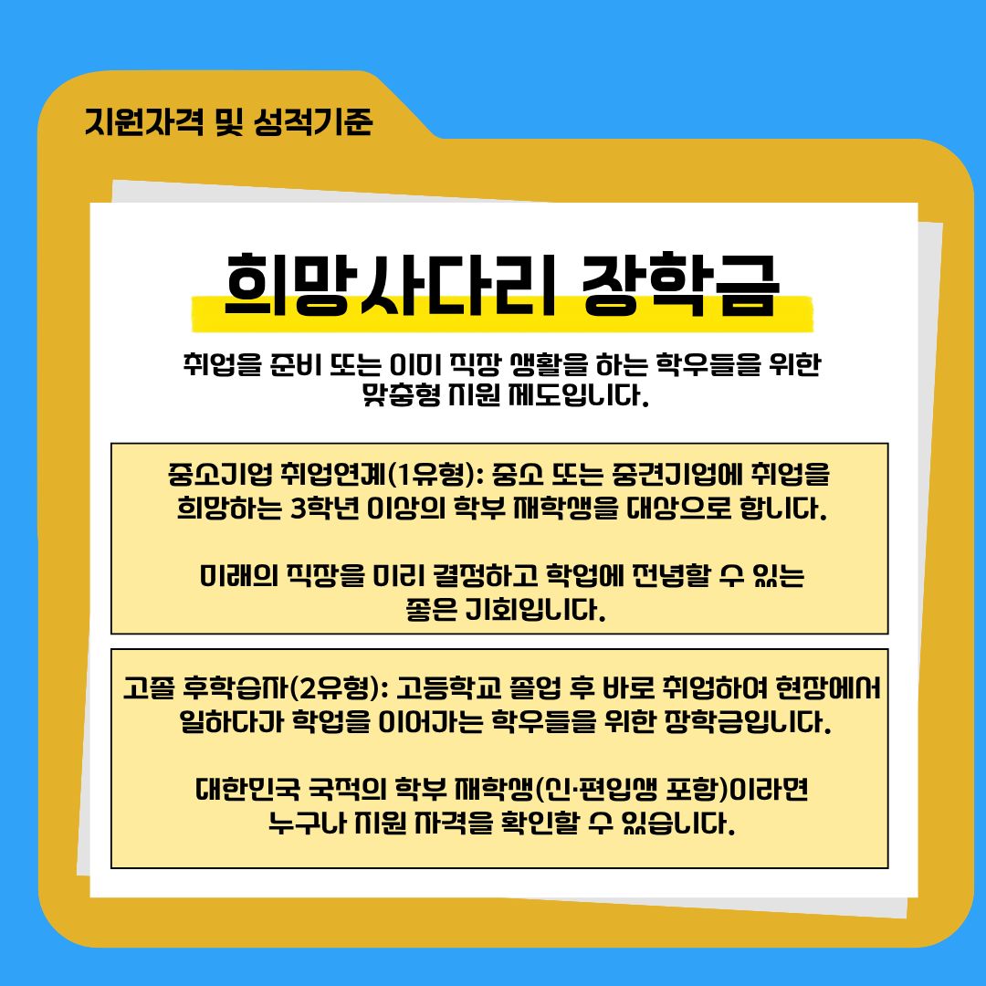 고졸 후학습자(2유형): 고등학교 졸업 후 바로 취업하여 현장에서 일하다가 학업을 이어가는 학우들을 위한 장학금입니다. 대한민국 국적의 학부 재학생(·편입생 포함)이라면 누구나 지원 자격을 확인할 수 있습니다.
