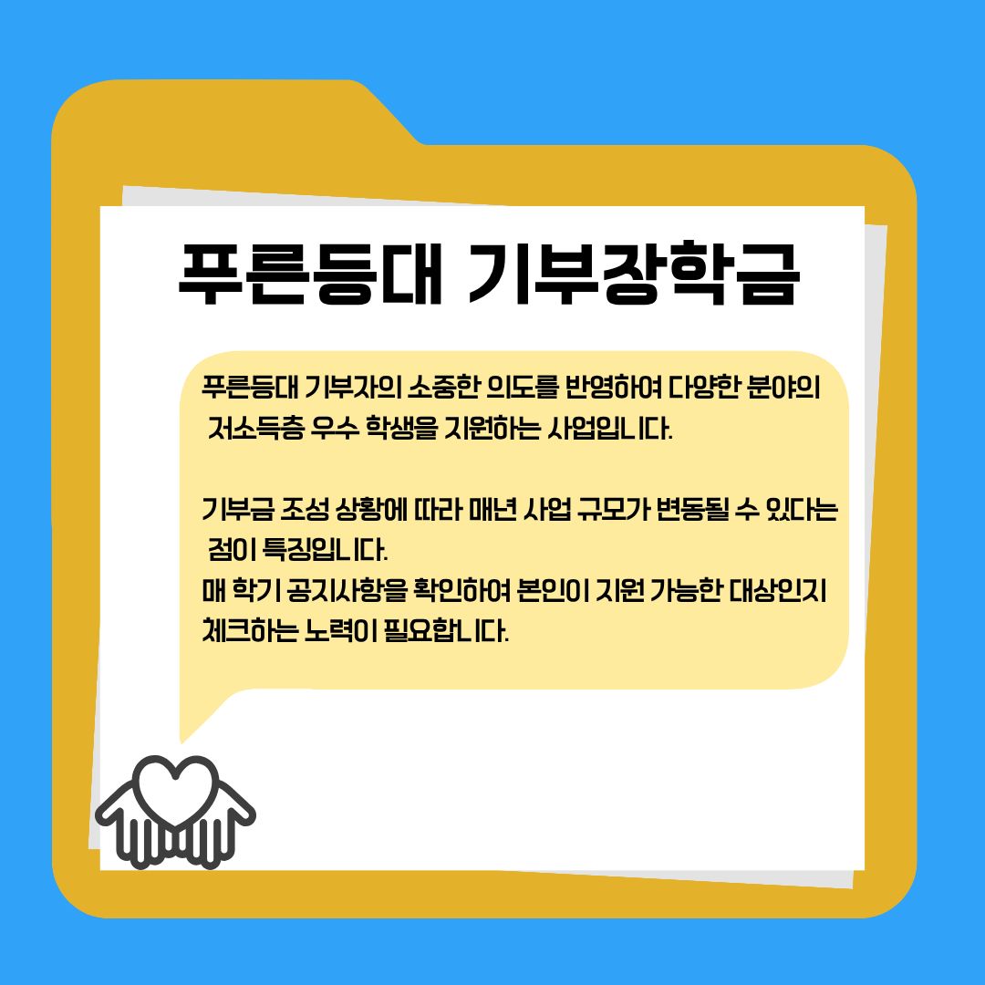 푸른등대 기부자의 소중한 의도를 반영하여 다양한 분야의 저소득층 우수 학생을 지원하는 사업입니다. 기부금 조성 상황에 따라 매년 사업 규모가 변동될 수 있다는 점이 특징입니다. 매 학기 공지사항을 확인하여 본인이 지원 가능한 대상인지 체크하는 노력이 필요합니다.