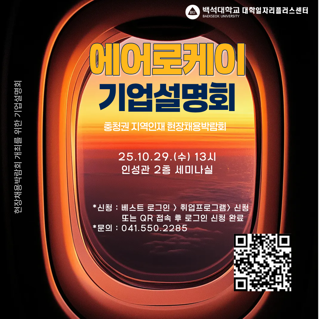 에어로케이 항공에서 현장채용 박람회 전 백석대학교 재학, 졸업생을 대상으로 사전 기업설명회를 진행합니다.
