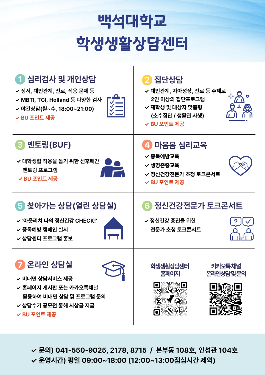 학생생활상담센터 홈페이지 / 카카오톡채널 / 교내게시판을 참고해주세요!!