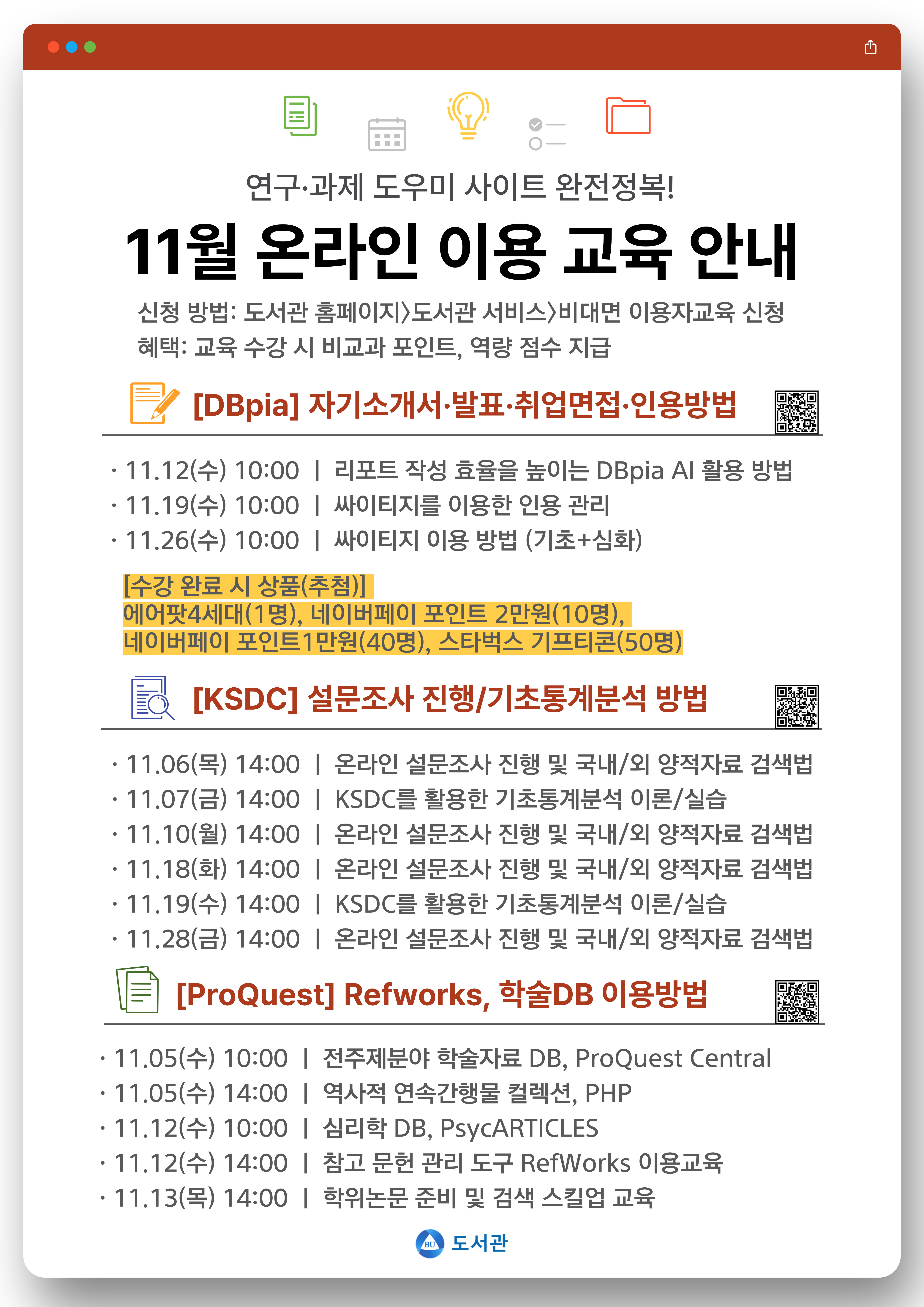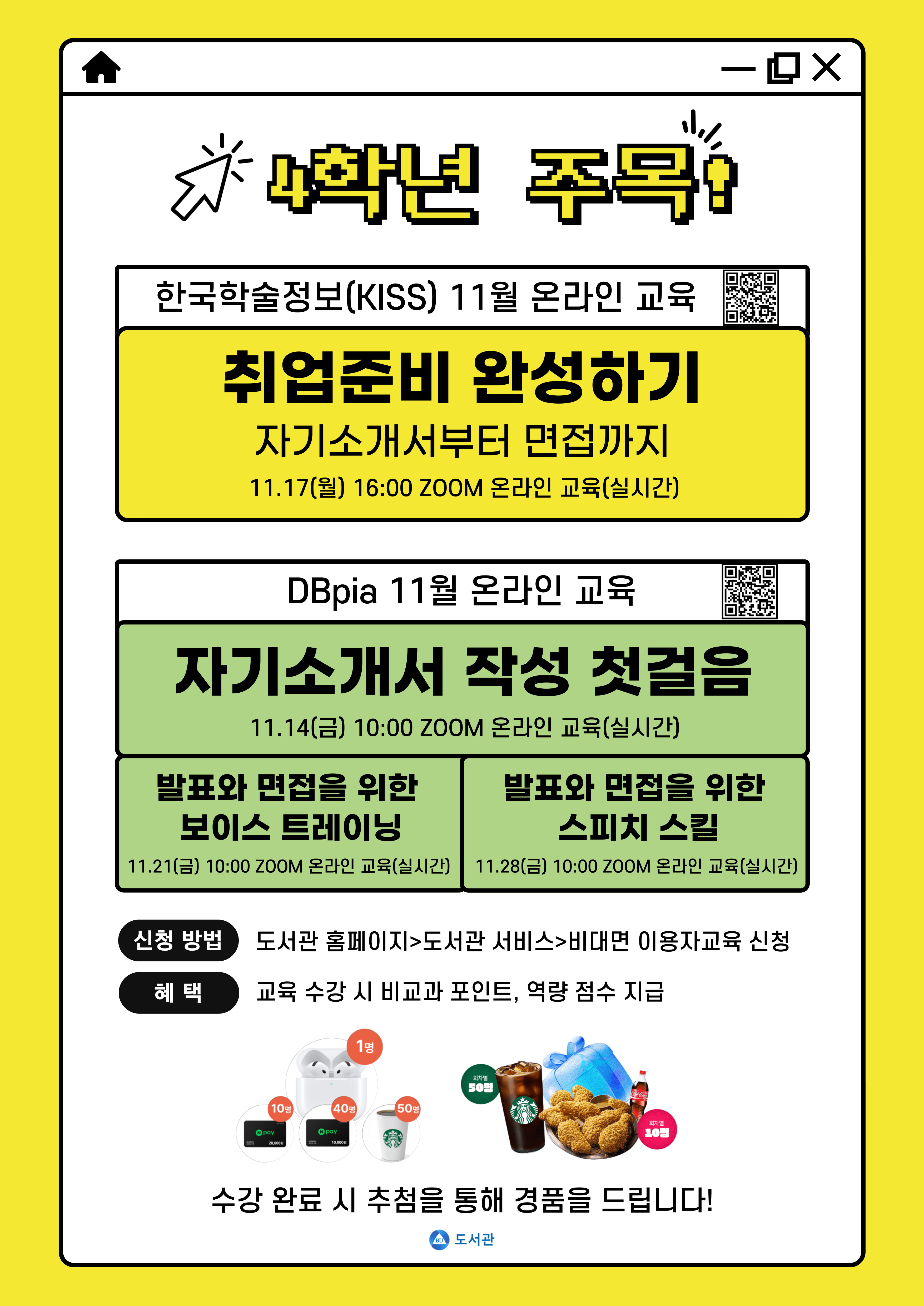 [도서관] 11월 온라인 이용자교육 - 자기소개서·발표·취업면접·기초통계·학술DB 활용법