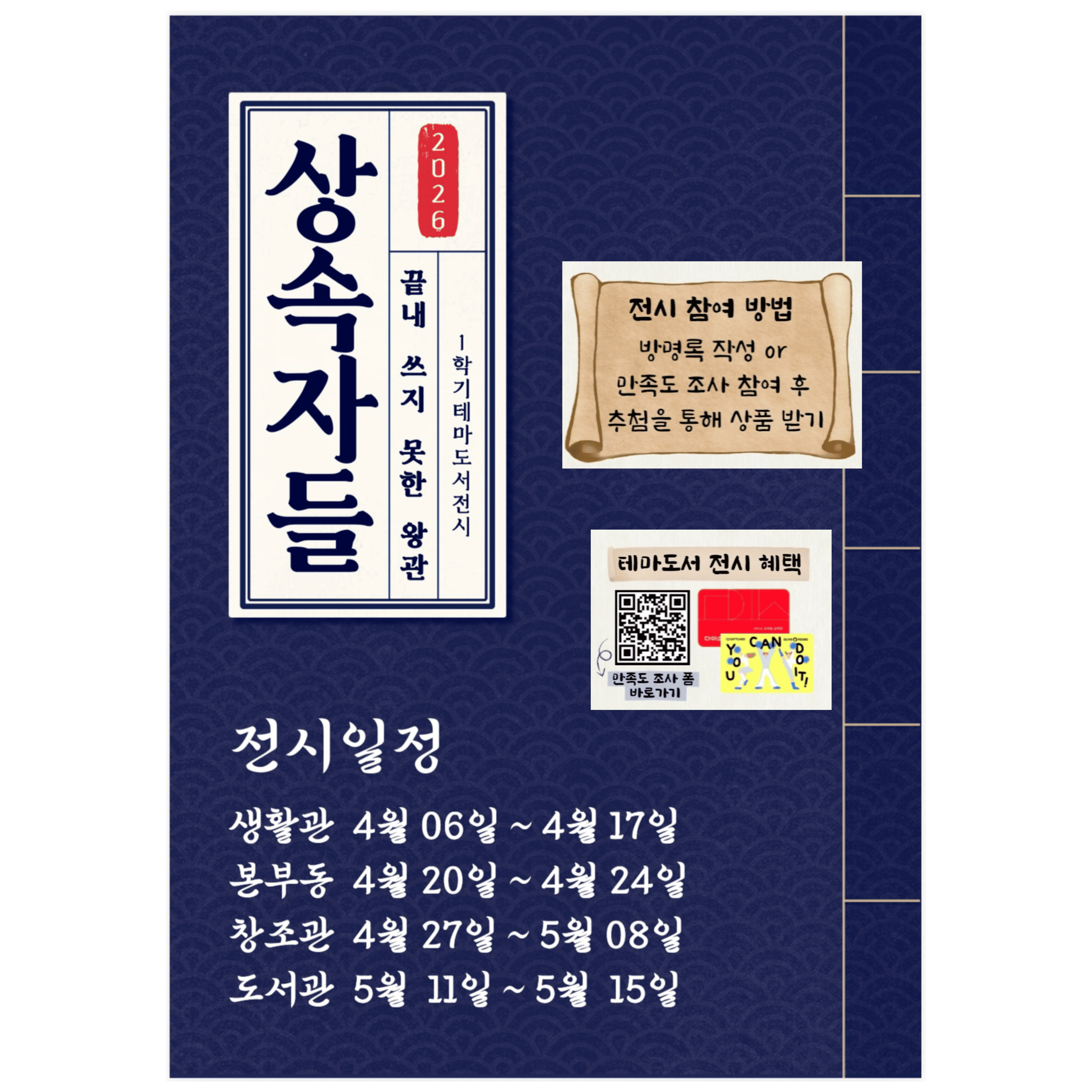 자유롭게 관람하시고, 만족도 조사 or 방명록을 참여하시면 추첨을 통해 상품을 드립니다.